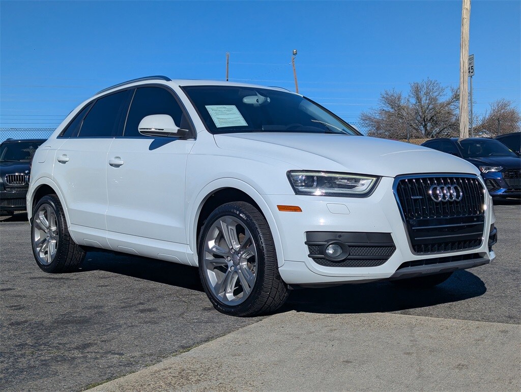 Glacier White 2015 Audi Q3 2.0T Prestige 2.0L 4-Cylinder TFSI 6-Speed Automatic with Tiptronic 4D Sport Utility Driver Assistance Package (Parking System Plus w/Rearview Camera), Prestige Package (Audi Connect w/Online Services, BOSE Surround Sound, Color Driver Information System w/Trip Computer, Driver Auto-Dimming & Power-Folding Side Mirrors, Power Tailgate, and Radio: MMI Navigation Plus w/Voice Control), 10 Speakers, 4-Wheel Disc Brakes, ABS brakes, Air Conditioning, Alloy wheels, AM/FM radio, Auto-dimming Rear-View mirror, Automatic temperature control, Axle Ratio: TBD, Brake assist, Bumpers: body-color, CD player, Compass, Delay-off headlights, Driver door bin, Driver vanity mirror, Dual front impact airbags, Dual front side impact airbags, Electronic Stability Control, First Aid Kit, Four wheel independent suspension, Front anti-roll bar, Front Bucket Seats, Front Center Armrest, Front dual zone A/C, Front fog lights, Front reading lights, Fully automatic headlights, Heated door mirrors, Heated Front Seats, Heated front seats, High intensity discharge headlights: Xenon plus, Illuminated entry, Leather Seating Surfaces, Leather Shift Knob, Leather steering wheel, Low tire pressure warning, Occupant sensing airbag, Outside temperature display, Overhead airbag, Overhead console, Panic alarm, Passenger door bin, Passenger vanity mirror, Power door mirrors, Power driver seat, Power moonroof, Power passenger seat, Power steering, Power windows, Radio data system, Radio: Audi Concert w/AM/FM/CD/SAT, Rain sensing wipers, Rear anti-roll bar, Rear fog lights, Rear reading lights, Rear seat center armrest, Rear window defroster, Rear window wiper, Remote keyless entry, Roof rack: rails only, Security system, Silver Homelink, Speed control, Speed-sensing steering, Split folding rear seat, Spoiler, Steering wheel mounted audio controls, Tachometer, Telescoping steering wheel, Tilt steering wheel, Traction control, Trip computer, Turn signal indicator mirrors, Variably intermittent wipers, and Wheels: 7.0J x 18" 5-Arm-Design.