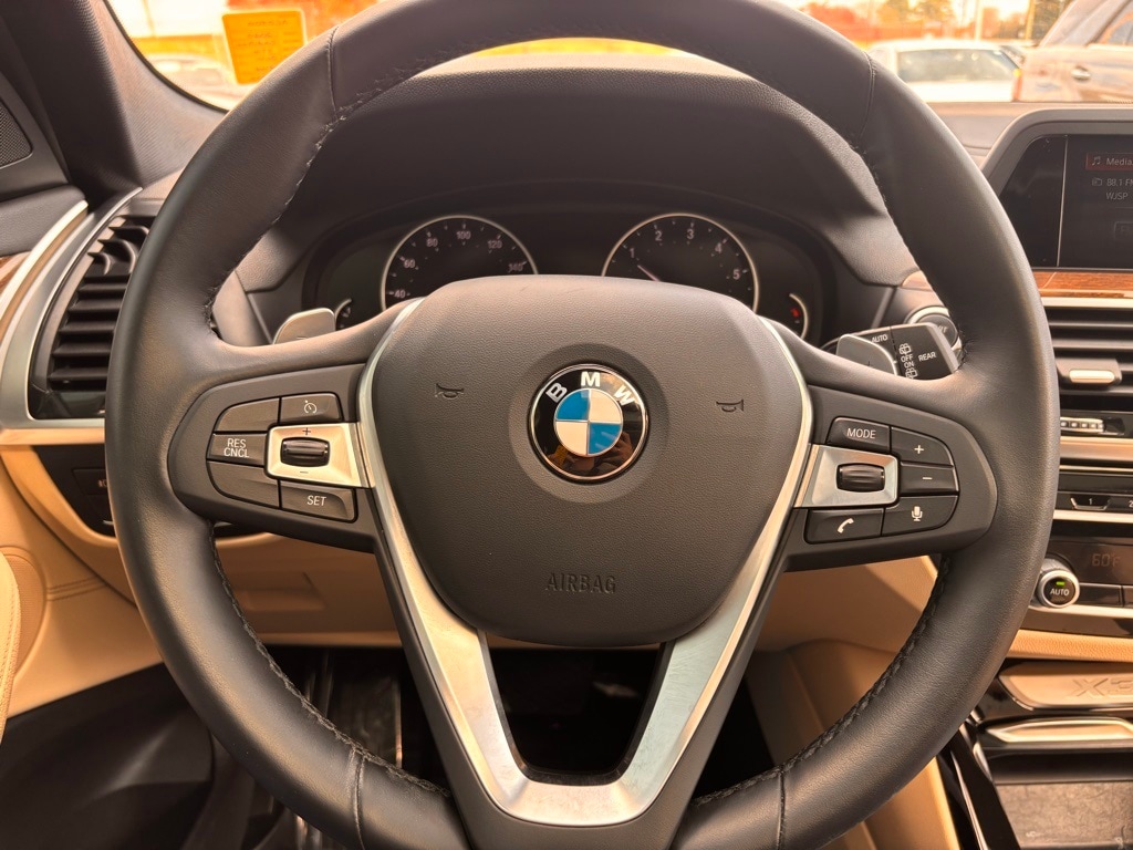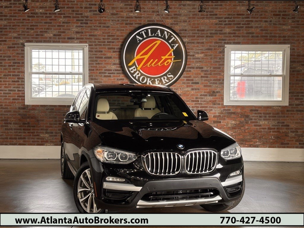 Jet Black 2019 BMW X3 xDrive30i 2.0L I4 TwinPower Turbo 8-Speed Automatic 4D Sport Utility Convenience Package (LED Headlights w/Cornering Lights, Lumbar Support, Panoramic Moonroof, and SiriusXM Satellite Radio), Driving Assistance Package (Active Blind Spot Detection, Active Driving Assistant, and Lane Departure Warning System), 12 Speakers, 3.385 Axle Ratio, 4-Wheel Disc Brakes, ABS brakes, Air Conditioning, Alloy wheels, AM/FM radio, Ambient Lighting, Auto-dimming door mirrors, Auto-dimming Rear-View mirror, Automatic temperature control, Brake assist, Bumpers: body-color, Comfort Access Keyless Entry, Delay-off headlights, Driver door bin, Driver vanity mirror, Dual front impact airbags, Dual front side impact airbags, DVD Area Coding (North America), Electronic Stability Control, Emergency communication system: BMW Assist eCall, Exterior Parking Camera Rear, Four wheel independent suspension, Front anti-roll bar, Front Bucket Seats, Front Center Armrest, Front dual zone A/C, Front fog lights, Front reading lights, Fully automatic headlights, Garage door transmitter, Genuine wood dashboard insert, Genuine wood door panel insert, Hands-Free Bluetooth & USB Audio Connection, Heated door mirrors, Hi-Fi Sound System, Illuminated entry, Knee airbag, Low tire pressure warning, Memory seat, Occupant sensing airbag, Outside temperature display, Overhead airbag, Panic alarm, Passenger door bin, Passenger vanity mirror, Power door mirrors, Power driver seat, Power Front Seats, Power Liftgate, Power passenger seat, Power steering, Power windows, Radio Control US, Radio data system, Radio: AM/FM Stereo w/HD, Rain sensing wipers, Rear air conditioning, Rear anti-roll bar, Rear reading lights, Rear seat center armrest, Rear window defroster, Rear window wiper, Remote keyless entry, Roof rack: rails only, Security system, SensaTec Upholstery, Speed control, Speed-sensing steering, Speed-Sensitive Wipers, Split folding rear seat, Spoiler, Sport Bucket Seats, Sport steering wheel, Steering wheel mounted audio controls, Tachometer, Telescoping steering wheel, Tilt steering wheel, Traction control, Trip computer, Turn signal indicator mirrors, Variably intermittent wipers, Wheels: 18" x 7.0" Y-Spoke (Style 688), and Wheels: 19" x 7.5" (Style 692)