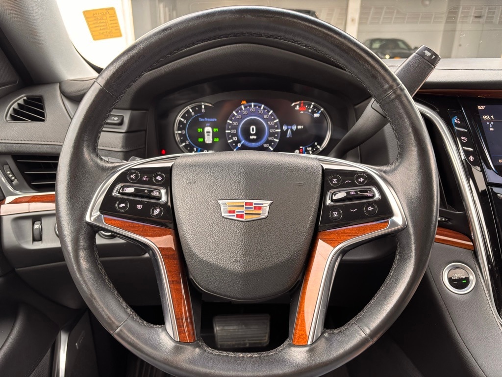 Black Raven 2016 Cadillac Escalade Luxury Vortec 6.2L V8 SIDI 8-Speed Automatic 4D Sport Utility Driver Awareness Package (Forward Collision Alert, IntelliBeam Headlamps, and Lane Keep Assist), Preferred Equipment Group 1SB (Power Tilt-Sliding Sunroof w/Express-Open/Close, Rear Cross-Traffic Alert, Reconfigurable 4-Color Head-Up Display, Second Row Bucket Seats, and Side Blind Zone Alert), Theft-Deterrent Package (Theft-Deterrent Alarm System, Vehicle Inclination Sensor, and Vehicle Interior Movement Sensor), 16 Speakers, 3.23 Axle Ratio, 3rd row seats: split-bench, 4-Wheel Disc Brakes, ABS brakes, Adaptive suspension, Adjustable pedals, Air Conditioning, Alloy wheels, AM/FM radio: SiriusXM, Apple CarPlay, Auto High-beam Headlights, Auto tilt-away steering wheel, Auto-dimming door mirrors, Auto-dimming Rear-View mirror, Auto-leveling suspension, Automatic temperature control, Bodyside moldings, Bose Centerpoint Surround Sound System, Brake assist, Bumpers: body-color, CD player, Compass, Delay-off headlights, Driver door bin, Driver vanity mirror, Dual front impact airbags, Dual front side impact airbags, DVD-Audio, Electronic Stability Control, Emergency communication system: OnStar, Exterior Parking Camera Rear, Front anti-roll bar, Front Bucket Seats, Front Center Armrest w/Storage, Front dual zone A/C, Front reading lights, Front wheel independent suspension, Fully automatic headlights, Garage door transmitter, HD Radio, Heads-Up Display, Heated & Cooled Front Bucket Seats, Heated door mirrors, Heated front seats, Heated rear seats, Heated steering wheel, Illuminated entry, Lane Departure Warning System, Leather Seating Surfaces, Leather Shift Knob, Leather steering wheel, Low tire pressure warning, Magnetic Ride Control Suspension, Memory seat, Navigation System, NavTraffic, Occupant sensing airbag, Outside temperature display, Overhead airbag, Overhead console, Panic alarm, Passenger door bin, Passenger vanity mirror, Pedal memory, Power door mirrors, Power driver seat, Power Liftgate, Power moonroof, Power passenger seat, Power steering, Power windows, Radio data system, Radio: Cadillac CUE Info/Media Ctrl Sys w/Embd Nav, Rain sensing wipers, Rear air conditioning, Rear anti-roll bar, Rear audio controls, Rear reading lights, Rear window defroster, Rear window wiper, Remote keyless entry, Roof rack: rails only, Security system, Single Slot CD/MP3 Player, SiriusXM Satellite Radio, Speed control, Split folding rear seat, Spoiler, Steering wheel memory, Steering wheel mounted audio controls, Tachometer, Telescoping steering wheel, Tilt steering wheel, Traction control, Trip computer, Turn signal indicator mirrors, Variably intermittent wipers, Ventilated front seats, Wheels: 22" 6-Spoke Split Manoogian Silver (LPO), Wheels: 22" x 9" 7-Spoke Aluminum, and Wheels: 22" x 9" Steel (LPO)