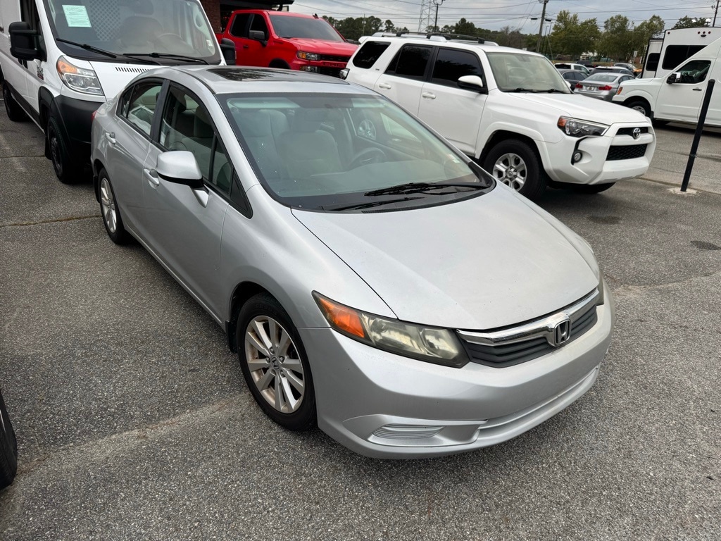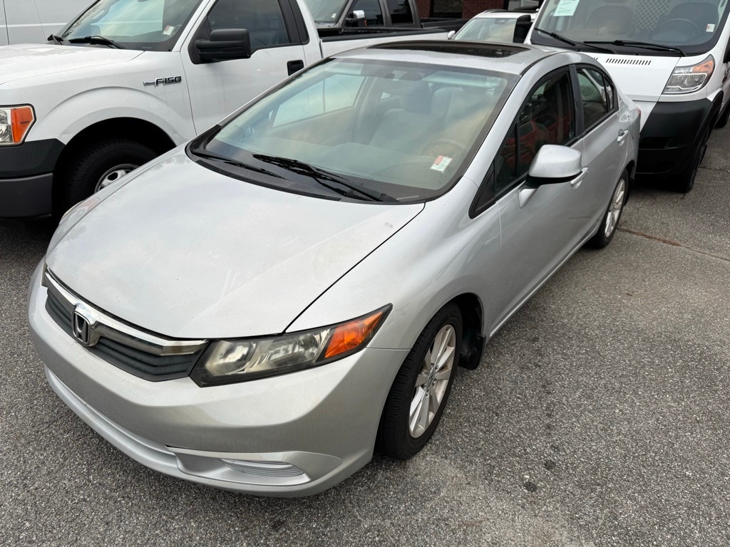 2012 Honda Civic EX 1.8L I4 SOHC 16V i-VTEC 5-Speed Automatic 4D Sedan 4-Wheel Disc Brakes, 6 Speakers, ABS brakes, Air Conditioning, Alloy wheels, Brake assist, Bumpers: body-color, CD player, Cloth Seat Trim, Delay-off headlights, Driver door bin, Driver vanity mirror, Dual front impact airbags, Dual front side impact airbags, Electronic Stability Control, Four wheel independent suspension, Front anti-roll bar, Front Bucket Seats, Front Center Armrest, Front reading lights, Illuminated entry, Low tire pressure warning, Occupant sensing airbag, Outside temperature display, Overhead airbag, Panic alarm, Passenger door bin, Passenger vanity mirror, Power door mirrors, Power moonroof, Power steering, Power windows, Radio data system, Rear anti-roll bar, Rear seat center armrest, Rear window defroster, Reclining Front Bucket Seats, Remote keyless entry, Security system, Speed control, Speed-sensing steering, Split folding rear seat, Steering wheel mounted audio controls, Tachometer, Telescoping steering wheel, Tilt steering wheel, Traction control, Trip computer, and Variably intermittent wipers.