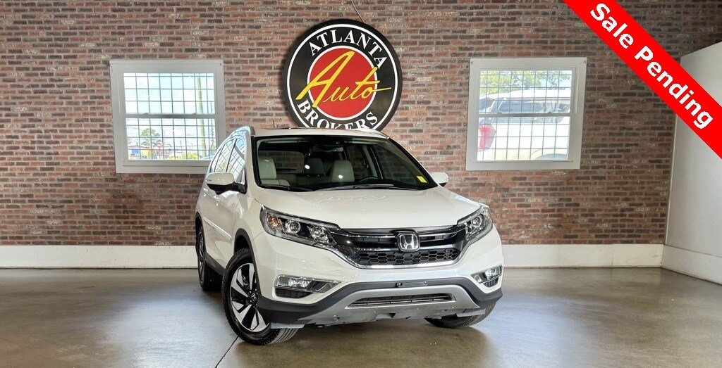 White 2015 Honda CR-V Touring 2.4L I4 DOHC 16V i-VTEC CVT 4D Sport Utility 18" Alloy Wheels, 4-Wheel Disc Brakes, 5.048 Axle Ratio, 7 Speakers, ABS brakes, Air Conditioning, Alloy wheels, AM/FM radio: SiriusXM, Auto-dimming Rear-View mirror, Automatic temperature control, Brake assist, Bumpers: body-color, CD player, Compass, Delay-off headlights, Driver door bin, Driver vanity mirror, Dual front impact airbags, Dual front side impact airbags, Electronic Stability Control, Exterior Parking Camera Rear, Four wheel independent suspension, Front anti-roll bar, Front Bucket Seats, Front Center Armrest, Front dual zone A/C, Front fog lights, Front reading lights, Garage door transmitter: HomeLink, Heated door mirrors, Heated Front Bucket Seats, Heated front seats, Illuminated entry, Lane Departure Warning System, Leather Seat Trim, Leather Shift Knob, Low tire pressure warning, Memory seat, Navigation System, Occupant sensing airbag, Outside temperature display, Overhead airbag, Overhead console, Panic alarm, Passenger door bin, Passenger vanity mirror, Power door mirrors, Power driver seat, Power Liftgate, Power moonroof, Power steering, Power windows, Radio data system, Radio: AM/FM/CD/HD/SiriusXM Audio System, Rear anti-roll bar, Rear seat center armrest, Rear window defroster, Rear window wiper, Remote keyless entry, Roof rack: rails only, Security system, Speed control, Speed-sensing steering, Speed-Sensitive Wipers, Split folding rear seat, Steering wheel mounted audio controls, Tachometer, Telescoping steering wheel, Tilt steering wheel, Traction control, Trip computer, Turn signal indicator mirrors, and Variably intermittent wipers.