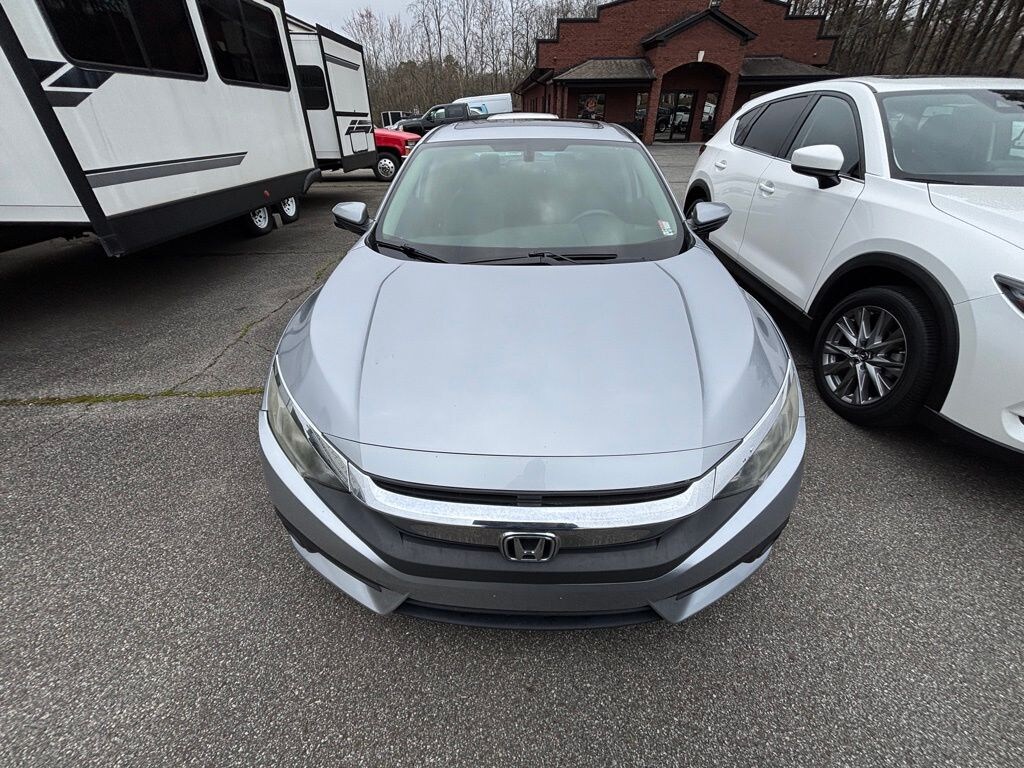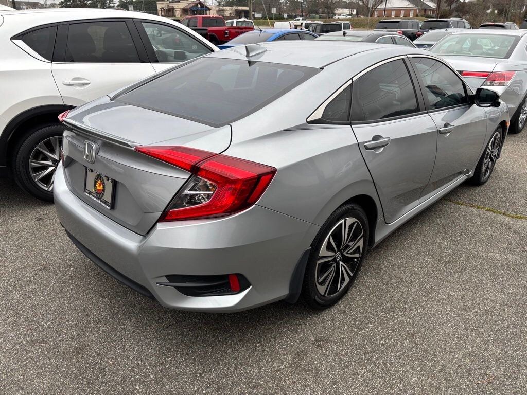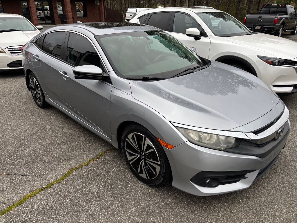 Silver 2016 Honda Civic EX-L 1.5L I-4 DI DOHC Turbocharged CVT 4D Sedan 17" Alloy Wheels, 4-Wheel Disc Brakes, 8 Speakers, ABS brakes, Air Conditioning, Alloy wheels, AM/FM radio: SiriusXM, Apple CarPlay/Android Auto, Auto-dimming Rear-View mirror, Automatic temperature control, Brake assist, Bumpers: body-color, Compass, Delay-off headlights, Driver door bin, Driver vanity mirror, Dual front impact airbags, Dual front side impact airbags, Electronic Stability Control, Emergency communication system: HondaLink Assist, Exterior Parking Camera Rear, Four wheel independent suspension, Front anti-roll bar, Front Bucket Seats, Front Center Armrest, Front dual zone A/C, Front fog lights, Front reading lights, Fully automatic headlights, Heated door mirrors, Heated front seats, Illuminated entry, Leather Seat Trim, Leather Shift Knob, Low tire pressure warning, Occupant sensing airbag, Outside temperature display, Overhead airbag, Panic alarm, Passenger door bin, Passenger vanity mirror, Power door mirrors, Power driver seat, Power moonroof, Power steering, Power windows, Radio data system, Radio: 180-Watt AM/FM/HD/SiriusXM Audio System, Rear anti-roll bar, Rear seat center armrest, Rear window defroster, Reclining Heated Front Bucket Seats, Remote keyless entry, Security system, Speed control, Speed-sensing steering, Speed-Sensitive Wipers, Split folding rear seat, Spoiler, Steering wheel mounted audio controls, Tachometer, Telescoping steering wheel, Tilt steering wheel, Traction control, Trip computer, and Variably intermittent wipers.