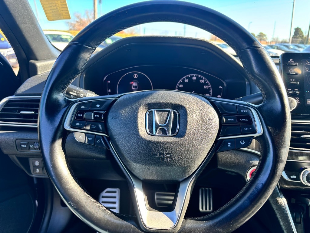 Crystal Black Pearl 2020 Honda Accord Sport 1.5T I4 DOHC 16V Turbocharged VTEC CVT 4D Sedan 4-Wheel Disc Brakes, 8 Speakers, ABS brakes, Adaptive Cruise Control: Adaptive Cruise Control (ACC) with Low-Speed Follow, Air Conditioning, Alloy wheels, AM/FM radio, Apple CarPlay/Android Auto, Auto High-beam Headlights, Automatic temperature control, Brake assist, Bumpers: body-color, Cloth Seat Trim, Delay-off headlights, Driver door bin, Driver vanity mirror, Dual front impact airbags, Dual front side impact airbags, Electronic Stability Control, Emergency communication system: HondaLink, Exterior Parking Camera Rear, Forward collision: Collision Mitigation Braking System (CMBS) + FCW mitigation, Four wheel independent suspension, Front anti-roll bar, Front Bucket Seats, Front Center Armrest, Front dual zone A/C, Front fog lights, Front reading lights, Fully automatic headlights, Illuminated entry, Knee airbag, Lane Departure Warning System, Leather Shift Knob, Leather steering wheel, Low tire pressure warning, Occupant sensing airbag, Outside temperature display, Overhead airbag, Overhead console, Panic alarm, Passenger door bin, Passenger vanity mirror, Power door mirrors, Power driver seat, Power steering, Power windows, Radio data system, Radio: 180-Watt AM/FM Audio System, Rear anti-roll bar, Rear seat center armrest, Rear window defroster, Remote keyless entry, Security system, Speed control, Speed-sensing steering, Speed-Sensitive Wipers, Split folding rear seat, Spoiler, Steering wheel mounted audio controls, Tachometer, Telescoping steering wheel, Tilt steering wheel, Traction control, Trip computer, Variably intermittent wipers, and Wheels: 19" Machine-Finished Alloy w/Black Inserts.