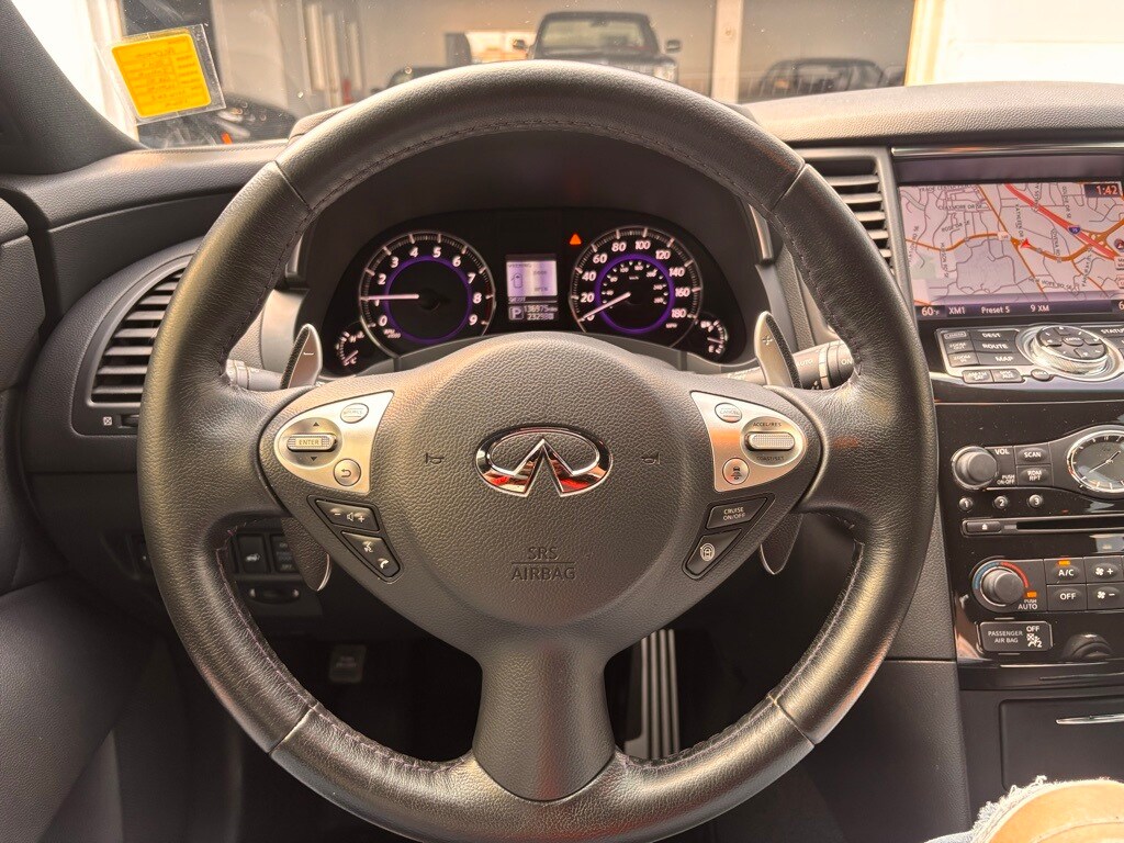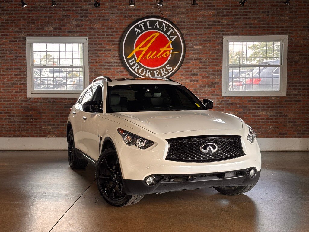 Majestic White 2017 INFINITI QX70 3.7L V6 7-Speed Automatic 4D Sport Utility Premium Package (Aluminum Roof Rails, Around View Monitor w/Front & Rear Sonar System, Dual Occupant Memory System, Entry & Exit Assist System, Outside Mirrors w/Reverse Tilt-Down Feature, Power Tilt/Telescopic Steering Column, and Radio: INFINITI Navigation System), Sport Package (Adaptive Front Lighting System, Aluminum Pedals, Climate Controlled Sport Style Front Seats, Dark Finish Front Grille, Dark Finish Lower Side Moldings, Dark Finish Outside Mirror Housing, Dark Finish Roof Rails, Red S Badge (Rear Hatch), Solid Magnesium Paddle Shifters, and Wheels: 21" x 9.5" 6-Spoke Enkei Aluminum-Alloy), Technology Package (Front Pre-Crash Seatbelts, Intelligent Brake Assist (IBA), Intelligent Cruise Control (Full-Speed Range), Lane Departure Warning System, and Rain-Sensing Front Windshield Wipers), 11 Speakers, 3.692 Axle Ratio, 4-Wheel Disc Brakes, ABS brakes, Air Conditioning, Alloy wheels, AM/FM radio: SiriusXM, Anti-whiplash front head restraints, Auto-dimming Rear-View mirror, Automatic temperature control, Block heater, Bodyside moldings, Brake assist, Bumpers: body-color, CD player, Compass, Delay-off headlights, Driver door bin, Driver vanity mirror, Dual front impact airbags, Dual front side impact airbags, Electronic Stability Control, Four wheel independent suspension, Front anti-roll bar, Front Bucket Seats, Front Center Armrest w/Storage, Front dual zone A/C, Front fog lights, Front reading lights, Fully automatic headlights, Garage door transmitter: HomeLink, Heated door mirrors, Heated Front Bucket Seats, Heated front seats, High intensity discharge headlights: Bi-Xenon, Illuminated entry, Leather Shift Knob, Leather steering wheel, Leather-Appointed Seat Trim, Low tire pressure warning, Occupant sensing airbag, Outside temperature display, Overhead airbag, Overhead console, Panic alarm, Passenger door bin, Passenger vanity mirror, Power door mirrors, Power driver seat, Power Liftgate, Power moonroof, Power passenger seat, Power steering, Power windows, Radio data system, Radio: AM/FM/CD/MP3 Playback Capability, Rear anti-roll bar, Rear reading lights, Rear seat center armrest, Rear window defroster, Rear window wiper, Remote keyless entry, Security system, Speed control, Speed-sensing steering, Speed-Sensitive Wipers, Split folding rear seat, Spoiler, Steering wheel mounted audio controls, Tachometer, Telescoping steering wheel, Tilt steering wheel, Traction control, Trip computer, Variably intermittent wipers, and Wheels: 18" x 8.0" Split 5-Spoke Aluminum Alloy.