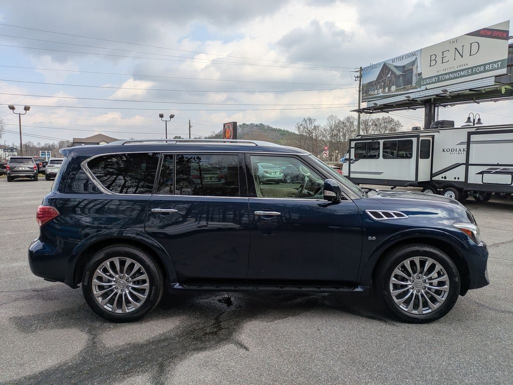 Hermosa Blue 2017 INFINITI QX80 5.6L V8 7-Speed Automatic 4D Sport Utility 22" Tire & Wheel Package (Wheels: 22" x 8.0" 14-Spoke Forged Aluminum-Alloy), Driver Assistance Package (Backup Collision Intervention (BCI), Blind Spot Intervention (BSI), Blind Spot Warning, Intelligent Cruise Control (Full-Speed Range), and Lane Departure Warning System), Theater Package (120V Power Outlet, Dual 7" Color Monitors, Heated 2nd-Row Seats, and Wireless Headphones (2)), 13 Speakers, 2.94 Axle Ratio, 3rd row seats: split-bench, 4-Wheel Disc Brakes, ABS brakes, Air Conditioning, Alloy wheels, AM/FM radio: SiriusXM, Anti-whiplash front head restraints, Auto High-beam Headlights, Auto tilt-away steering wheel, Auto-dimming door mirrors, Auto-dimming Rear-View mirror, Auto-leveling suspension, Automatic temperature control, Bose Premium Sound System, Brake assist, Bumpers: body-color, Carpeted Cargo Mat/Cargo Net & First Aid Kit, CD player, Delay-off headlights, Driver door bin, Driver vanity mirror, Dual front impact airbags, Dual front side impact airbags, Electronic Stability Control, Emergency communication system: INFINITI Connection, Four wheel independent suspension, Front anti-roll bar, Front Bucket Seats, Front Center Armrest, Front dual zone A/C, Front fog lights, Front reading lights, Fully automatic headlights, Garage door transmitter: HomeLink, Genuine wood console insert, Genuine wood dashboard insert, Genuine wood door panel insert, Heated door mirrors, Heated Front Bucket Seats, Heated front seats, Heated steering wheel, Illuminated entry, Leather Shift Knob, Leather steering wheel, Leather-Appointed Seats w/Mocha Burl Trim, Low tire pressure warning, Memory seat, Navigation System, Occupant sensing airbag, Outside temperature display, Overhead airbag, Overhead console, Panic alarm, Passenger door bin, Passenger vanity mirror, Power door mirrors, Power driver seat, Power Liftgate, Power moonroof, Power passenger seat, Power steering, Power windows, Radio data system, Rain sensing wipers, Rear air conditioning, Rear anti-roll bar, Rear audio controls, Rear reading lights, Rear seat center armrest, Rear window defroster, Rear window wiper, Reclining 3rd row seat, Remote keyless entry, Roof rack: rails only, Security system, Speed control, Speed-sensing steering, Split folding rear seat, Spoiler, Steering wheel memory, Steering wheel mounted audio controls, Tachometer, Telescoping steering wheel, Tilt steering wheel, Traction control, Trip computer, Turn signal indicator mirrors, Variably intermittent wipers, Voltmeter, and Wheels: 20" x 8.0" Split 6-Spoke Aluminum-Alloy.
