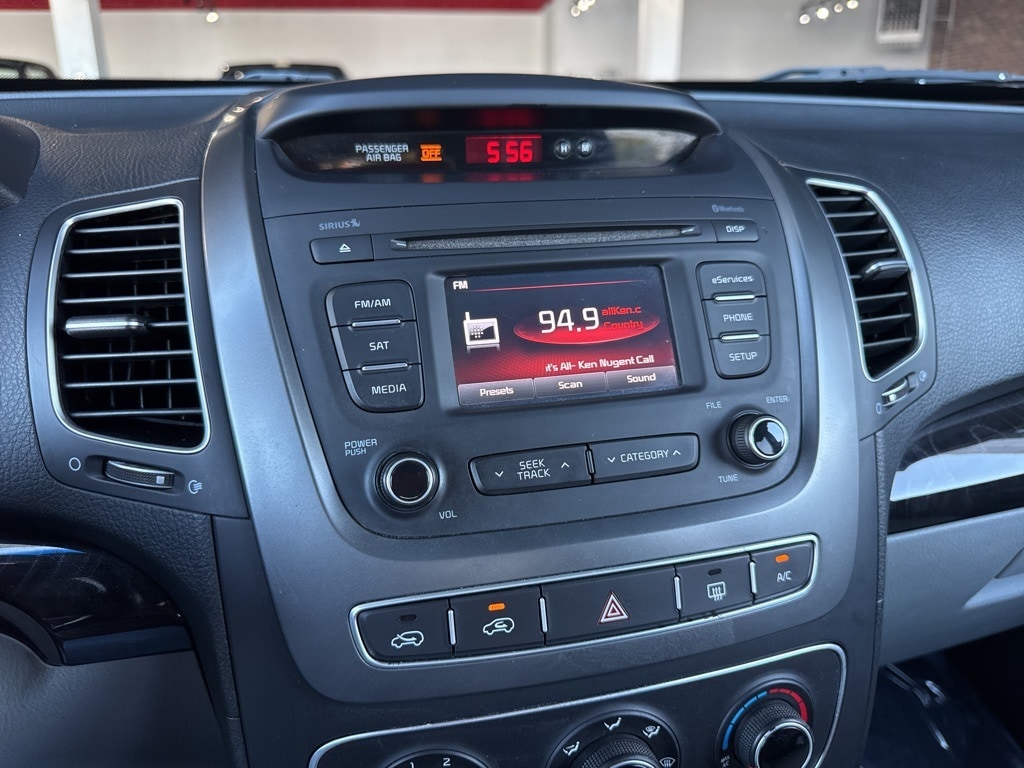 Bright Silver 2014 Kia Sorento LX 2.4L I4 DGI DOHC Dual CVVT 6-Speed Automatic with Sportmatic 4D Sport Utility LX Convenience Package (5 Seat) (2nd Row Sunscreen, Auto-Dimming Rear-View Mirror w/Compass, Backup Warning System, Carpet Floor Mats (5 Seat), Fog Lamps, Heated Front Seats, Leather Wrapped Steering Wheel & Gear Shift Knob, Roof Rails, and UVO Audio w/eServices & Backup Camera Display), 3.65 Axle Ratio, 4-Wheel Disc Brakes, 6 Speakers, ABS brakes, Air Conditioning, Alloy wheels, AM/FM radio: SiriusXM, AM/FM/CD/MP3 Audio System, Anti-whiplash front head restraints, Brake assist, Bumpers: body-color, CD player, Delay-off headlights, Driver door bin, Driver vanity mirror, Dual front impact airbags, Dual front side impact airbags, Electronic Stability Control, Four wheel independent suspension, Front anti-roll bar, Front Bucket Seats, Front Center Armrest, Front reading lights, Heated door mirrors, Illuminated entry, Leather Seat Trim, Low tire pressure warning, Occupant sensing airbag, Overhead airbag, Overhead console, Panic alarm, Passenger door bin, Passenger vanity mirror, Power door mirrors, Power steering, Power windows, Rear anti-roll bar, Rear seat center armrest, Rear window defroster, Rear window wiper, Remote keyless entry, Speed control, Speed-sensing steering, Split folding rear seat, Steering wheel mounted audio controls, Tachometer, Telescoping steering wheel, Tilt steering wheel, Traction control, Tricot Fabric Seat Trim, Trip computer, Turn signal indicator mirrors, Variably intermittent wipers, and Wheels: 17" x 7.0 Silver Painted Alloy.