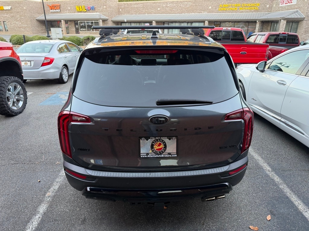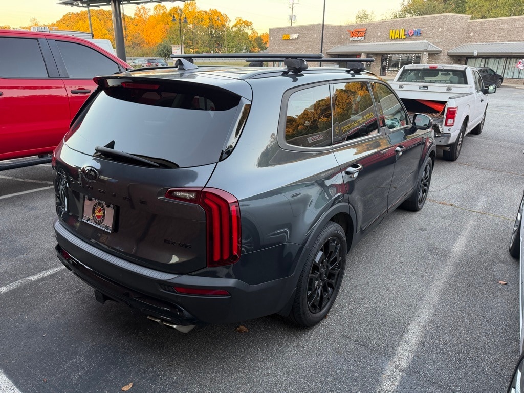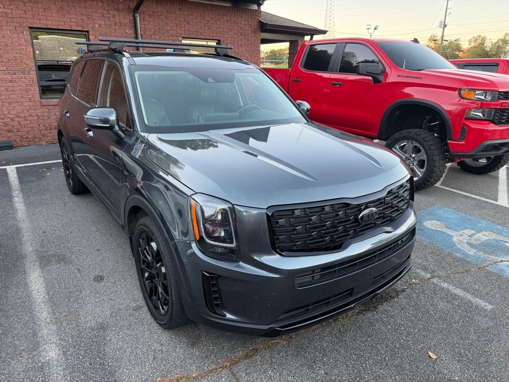 Gravity Gray 2021 Kia Telluride EX 3.8L V6 DGI DOHC Dual CVVT 8-Speed Automatic 4D Sport Utility EX Premium Package (2nd Row Captain Chairs, LED Headlamps, Satin Chrome Roof Rails, and Wheels: 7.5" x 20" Machined Finish Alloy), Nightfall Edition Package (Black Finish Radiator Grille, Exclusive Black Headlight Bezels, Front & Rear Gloss Black Finish Bumper Skid Plates, Front & Rear KIA Logo, Gloss Black Finish Exterior Emblems, Gloss Black Finish Front & Rear Door Garnish, Gloss Black Finish Roof Rails, and Wheels: 7.5" x 20" Exclusive Black Finish Alloy), Towing Package (Self Leveling Rear Suspension and Tow Hitch w/Harness (TOF)), 3.648 Axle Ratio, 3rd row seats: split-bench, 4-Wheel Disc Brakes, 6 Speakers, ABS brakes, Air Conditioning, Alloy wheels, AM/FM radio: SiriusXM, Apple CarPlay & Android Auto, Auto-dimming Rear-View mirror, Automatic temperature control, Brake assist, Bumpers: body-color, Cargo Cover, Carpeted Floor Mats, Compass, Delay-off headlights, Driver door bin, Driver vanity mirror, Dual front impact airbags, Dual front side impact airbags, Electronic Stability Control, Emergency communication system: 911 Connect, Folding Cargo Tray, Four wheel independent suspension, Front anti-roll bar, Front Bucket Seats, Front Center Armrest, Front dual zone A/C, Front reading lights, Fully automatic headlights, Heated & Ventilated Front Bucket Seats, Heated door mirrors, Heated front seats, Heated steering wheel, Illuminated entry, Illuminated Scuff Plates, Knee airbag, Leather Seat Trim, Leather Shift Knob, Leather steering wheel, Low tire pressure warning, Mud Guard Kit, Navigation System, Occupant sensing airbag, Outside temperature display, Overhead airbag, Overhead console, Panic alarm, Passenger door bin, Passenger vanity mirror, Power door mirrors, Power driver seat, Power Liftgate, Power moonroof, Power passenger seat, Power steering, Power windows, Radio data system, Radio: AM/FM/SIRIUS Display Audio, Rear air conditioning, Rear anti-roll bar, Rear audio controls, Rear Bumper Protector, Rear reading lights, Rear seat center armrest, Rear window defroster, Rear window wiper, Reclining 3rd row seat, Remote keyless entry, Roof rack: rails only, Security system, Smart Key w/ Push Button and Remote Start, Speed control, Speed-sensing steering, Split folding rear seat, Spoiler, Steering wheel mounted audio controls, Tachometer, Telescoping steering wheel, Tilt steering wheel, Traction control, Trip computer, Turn signal indicator mirrors, Variably intermittent wipers, Ventilated front seats, and Wheels: 7.5" x 18" Machined Finish Alloy.