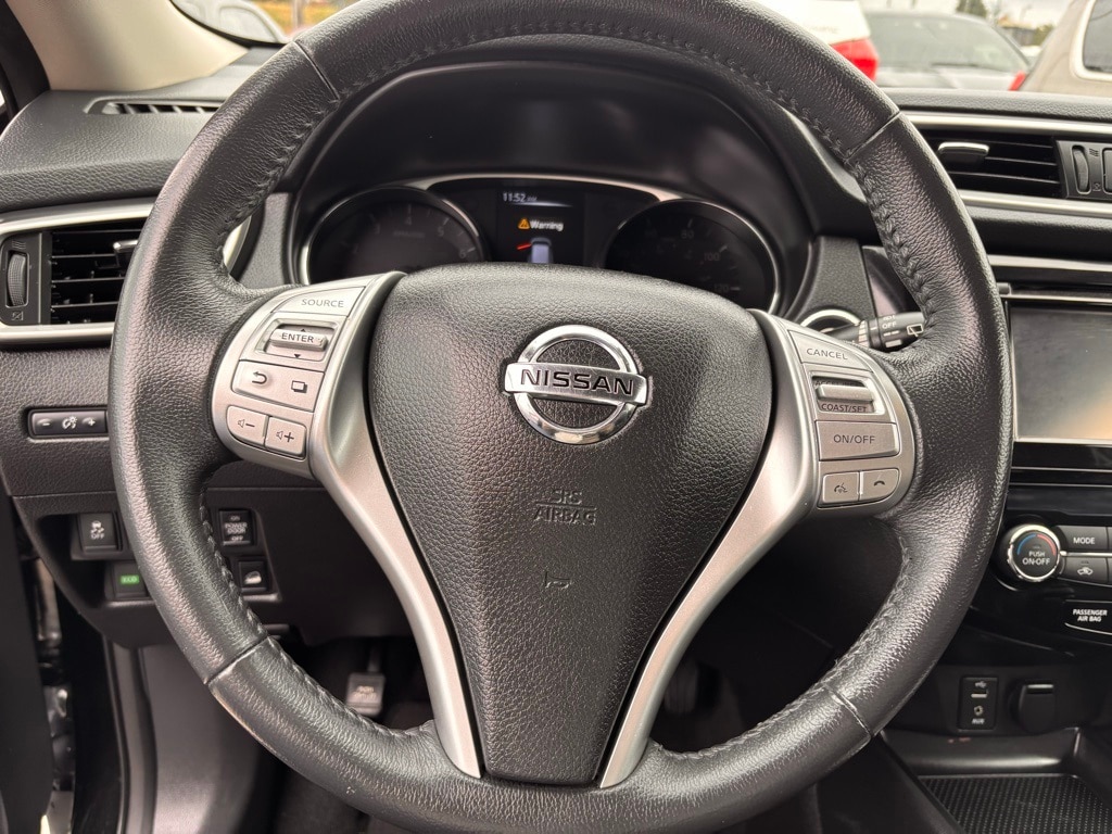 Magnetic Black 2016 Nissan Rogue SL 2.5L I4 DOHC 16V CVT with Xtronic 4D Sport Utility 18" Alloy Wheels, 4-Wheel Disc Brakes, 5.694 Axle Ratio, 9 Speakers, ABS brakes, Activation Disclaimer, Air Conditioning, Alloy wheels, AM/FM radio: SiriusXM, Anti-whiplash front head restraints, Auto Dimming Inside Mirror, Automatic temperature control, Brake assist, Bumpers: body-color, CD player, Chrome Rear Bumper Protector, Compass, Delay-off headlights, Driver door bin, Driver vanity mirror, Dual front impact airbags, Dual front side impact airbags, Electronic Stability Control, Emergency communication system, Floor Mats & 2-PC Cargo Area Protector, Four wheel independent suspension, Front anti-roll bar, Front Bucket Seats, Front Center Armrest w/Storage, Front dual zone A/C, Front fog lights, Front reading lights, Fully automatic headlights, Heated door mirrors, Heated Front Bucket Seats, Heated front seats, HomeLink, Illuminated entry, Leather Shift Knob, Leather-Appointed Seat Trim, Low tire pressure warning, Navigation System, Occupant sensing airbag, Outside temperature display, Overhead airbag, Overhead console, Panic alarm, Passenger door bin, Passenger vanity mirror, Power door mirrors, Power driver seat, Power Liftgate, Power steering, Power windows, Radio data system, Radio: AM/FM/CD/RDS/AUX NissanConnect w/Navigation, Rear anti-roll bar, Rear seat center armrest, Rear window defroster, Rear window wiper, Remote keyless entry, Retractable Cargo Cover, Roof rack: rails only, Security system, Speed control, Speed-sensing steering, Splash Guards, Split folding rear seat, Spoiler, Steering wheel mounted audio controls, Tachometer, Telescoping steering wheel, Tilt steering wheel, Traction control, Trip computer, Turn signal indicator mirrors, and Variably intermittent wipers.