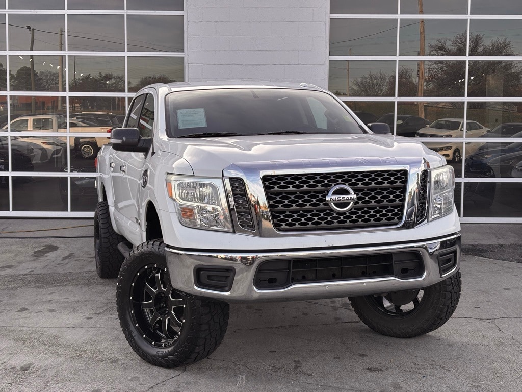 Glacier White 2017 Nissan Titan SV 5.6L V8 7-Speed Automatic 4D Crew Cab 2.937 Axle Ratio, 4-Wheel Disc Brakes, 6 Speakers, ABS brakes, Air Conditioning, Alloy wheels, AM/FM radio: SiriusXM, Brake assist, Bumpers: chrome, Carpeted Floor Mats, CD player, Driver door bin, Driver vanity mirror, Dual front impact airbags, Dual front side impact airbags, Electronic Stability Control, Electronic Tailgate Lock, Front anti-roll bar, Front Center Armrest w/Storage, Front Manual Split Bench Seat (40/20/40), Front reading lights, Front wheel independent suspension, Heated door mirrors, Heated Front Captain's Chairs, Illuminated entry, Leather Seat Trim, Low tire pressure warning, Occupant sensing airbag, Outside temperature display, Overhead airbag, Overhead console, Panic alarm, Passenger door bin, Passenger vanity mirror, Power door mirrors, Power steering, Power windows, Radio data system, Radio: NissanConnect w/SiriusXM & Mobile Apps, Rear anti-roll bar, Rear seat center armrest, Rear step bumper, Rear window defroster, Remote keyless entry, Security system, Speed control, Speed-sensing steering, Speed-Sensitive Wipers, Splash Guards, Split folding rear seat, Steering wheel mounted audio controls, Tachometer, Telescoping steering wheel, Tilt steering wheel, Traction control, Trip computer, Turn signal indicator mirrors, Variably intermittent wipers, Voltmeter, and Wheels: 18" x 8" Silver Painted Alloy.