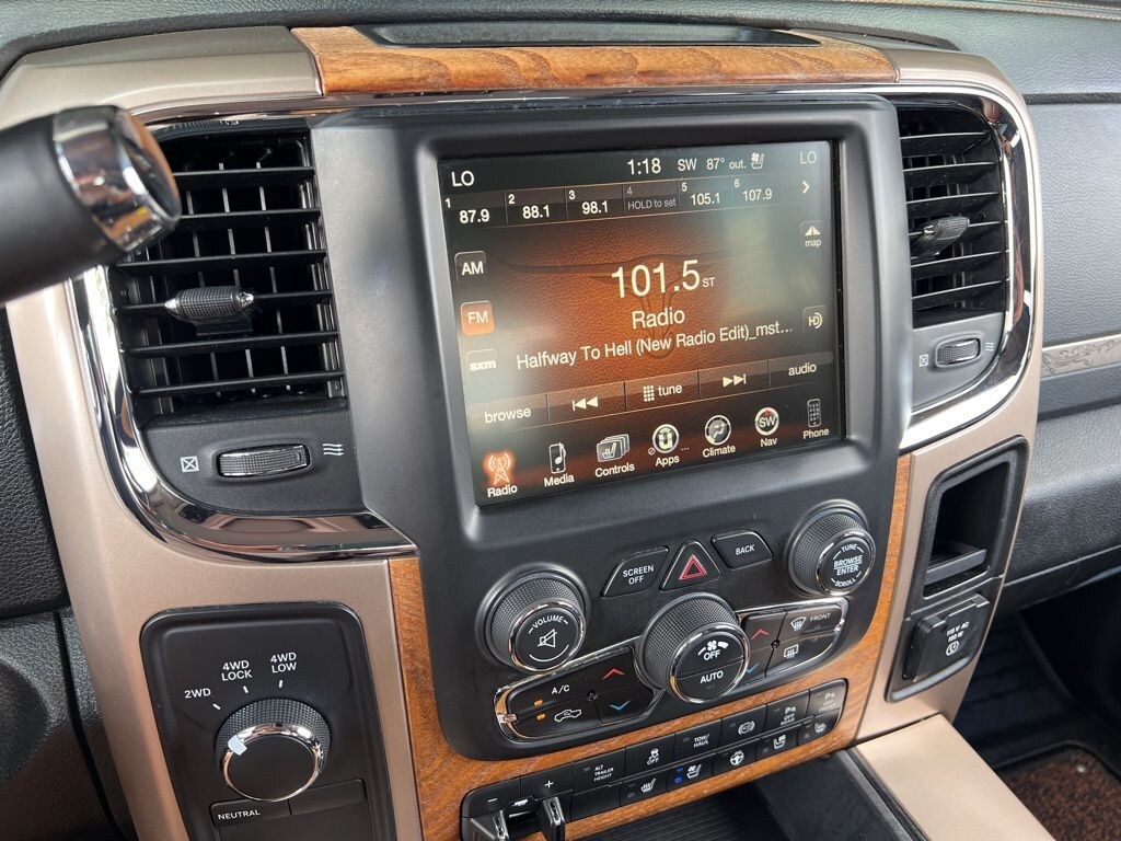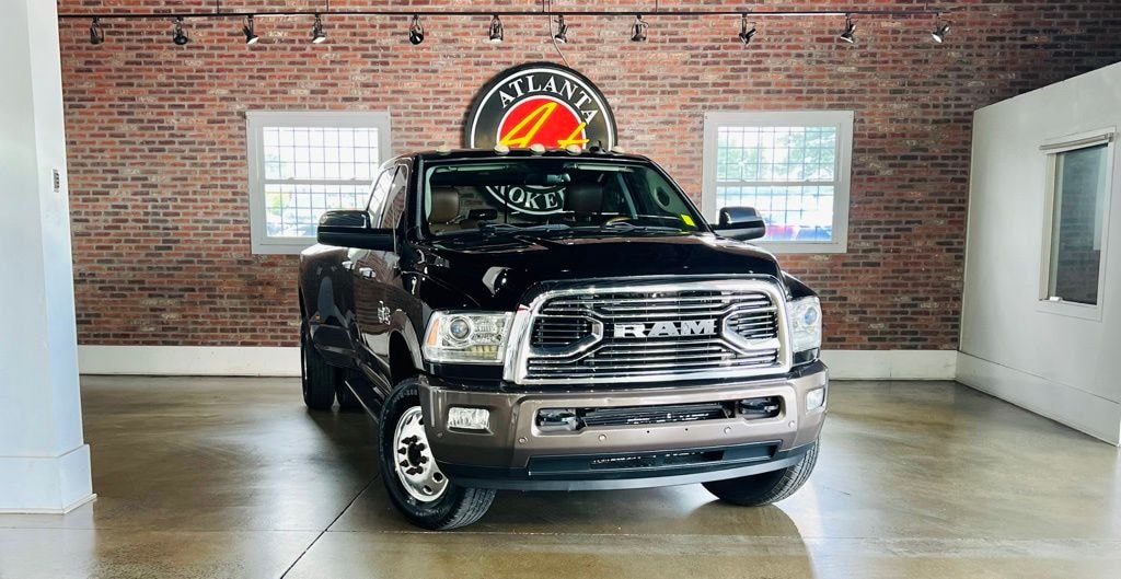 Brilliant Black Crystal Pearlcoat 2017 Ram 3500 Laramie Longhorn Cummins 6.7L I6 Turbodiesel 6-Speed Automatic 4D Crew Cab Convenience Group, Quick Order Package 2FK Laramie Longhorn (Chrome Belt Moldings and Chrome Grille w/RAM Letters), 10 Speakers, 115V Auxiliary Power Outlet, 220 Amp Alternator, 4-Wheel Disc Brakes, 4.10 Axle Ratio, 5th Wheel/Gooseneck Towing Prep Group, 6000# Front Axle w/Hub Ext, ABS brakes, Adjustable pedals, Air Conditioning, Alloy wheels, AM/FM radio: SiriusXM, Audio memory, Auto Level Rear Air Suspension, Auto-dimming Rear-View mirror, Automatic temperature control, Brake assist, Bucket Seats, Center Hub, Clearance Lamps, Compass, Delay-off headlights, Driver door bin, Driver vanity mirror, Dual Alternators Rated At 440 Amps, Dual front impact airbags, Dual front side impact airbags, Dual Rear Wheel Fender Flare Tracking, Dual Rear Wheels, Electronic Stability Control, Electronically Controlled Throttle, Emergency communication system, Folding Flat Load Floor Storage, Front anti-roll bar, Front Bucket Seats, Front Center Armrest w/Storage, Front dual zone A/C, Front fog lights, Front reading lights, Fully automatic headlights, Garage door transmitter, Genuine wood console insert, Genuine wood dashboard insert, Genuine wood door panel insert, Heated door mirrors, Heated Front Seats, Heated front seats, Heated rear seats, Heated Second Row Seats, Heated Steering Wheel, Heated steering wheel, High Back Seats, Illuminated entry, Keyless Enter-N-Go, Leather steering wheel, Low tire pressure warning, Memory seat, Navigation System, Occupant sensing airbag, Outside temperature display, Overhead airbag, Overhead console, Panic alarm, ParkView Rear Back-Up Camera, Passenger door bin, Passenger vanity mirror, Pedal memory, Power 10-Way Memory Driver & 6-Way Passenger Seats, Power door mirrors, Power driver seat, Power Lumbar Adjust, Power passenger seat, Power steering, Power Sunroof, Power windows, Premium Filigree Leather Seats, Radio data system, Radio: Uconnect 3C NAV w/8.4" Display, Rear 60/40 Split Folding Seat, Rear reading lights, Rear seat center armrest, Rear step bumper, Remote keyless entry, Remote Proximity Keyless Entry, Security system, Speed control, Split folding rear seat, Steering wheel mounted audio controls, Tachometer, Tilt steering wheel, Tip Start, Tire Pressure Monitoring Delete, Traction control, Trip computer, Turn signal indicator mirrors, Variably intermittent wipers, Ventilated Front Seats, Ventilated front seats, Voltmeter, Wheels: 17" x 6.0" Premium Aluminum, and Wheels: 18" x 8.0" Aluminum w/Walnut Pockets.