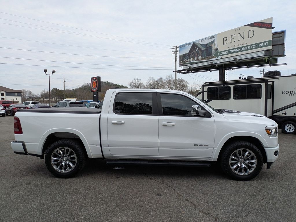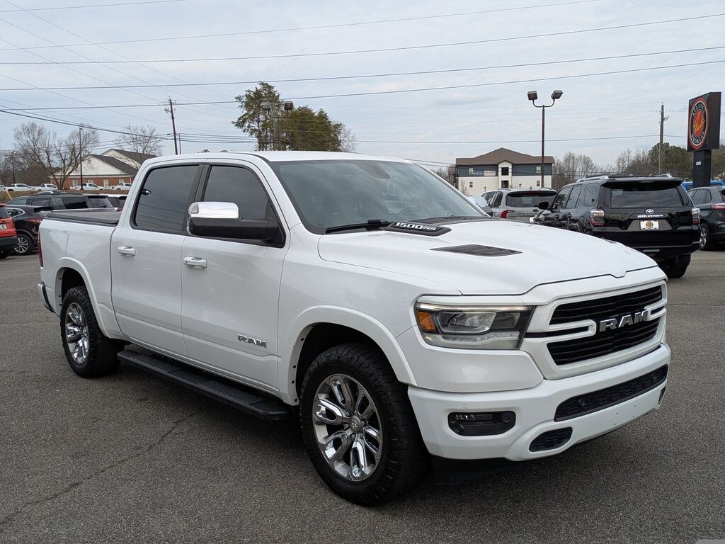 Bright White Clearcoat 2020 Ram 1500 Laramie HEMI 5.7L V8 Multi Displacement VVT 8-Speed Automatic 4D Crew Cab Laramie Level 2 Equipment Group (1-Yr SiriusXM Guardian Trial, 4G LTE Wi-Fi Hot Spot, 5-Year SiriusXM Traffic Service, 5-Year SiriusXM Travel Link Service, 8.4" Touchscreen Display, Apple CarPlay, Disassociated Touchscreen Display, For Details, Visit DriveUconnect.com, GPS Antenna Input, GPS Navigation, HD Radio, Integrated Center Stack Radio, Radio: Uconnect 4C Nav w/8.4" Display, Rear Underseat Compartment Storage, SiriusXM Satellite Radio, SiriusXM Traffic Plus, and SiriusXM Travel Link), Quick Order Package 27H Laramie, Sport Appearance Package (Wheels: 20" x 9" Premium Painted w/Inserts), Trailer Tow Group (Trailer Brake Control), #1 Seat Foam Cushion, 10 Speakers, 3 Rear Seat Head Restraints, 3.21 Rear Axle Ratio, 4 Way Front Headrests, 4-Wheel Disc Brakes, 48V Belt Starter Generator, ABS brakes, Adjustable pedals, Air Conditioning, Alloy wheels, AM/FM radio: SiriusXM, Apple CarPlay/Android Auto, Audio memory, Auto-dimming door mirrors, Auto-dimming Rear-View mirror, Automatic temperature control, Brake assist, Bumpers: chrome, Compass, Delay-off headlights, Driver door bin, Driver Seat Memory, Driver vanity mirror, Dual front impact airbags, Dual front side impact airbags, Electronic Stability Control, Front & Rear Rubber Floor Mats, Front anti-roll bar, Front Center Armrest w/Storage, Front dual zone A/C, Front fog lights, Front reading lights, Front Seat Back Map Pockets, Front wheel independent suspension, Fully automatic headlights, Garage door transmitter, Google Android Auto, Heated door mirrors, Heated Front Seats, Heated front seats, Heated Steering Wheel, Heated steering wheel, Illuminated entry, Leather steering wheel, Leather Trim 40/20/40 Bench Seat, Low tire pressure warning, Memory seat, Occupant sensing airbag, Outside temperature display, Overhead airbag, Overhead console, Panic alarm, ParkSense Front/Rear Park Assist w/Stop (DISC), ParkView Rear Back-Up Camera, Passenger door bin, Passenger vanity mirror, Pedal memory, Power 4-Way Driver Lumbar Adjust, Power 4-Way Passenger Lumbar Adjust, Power 8-Way Driver & Passenger Seats, Power door mirrors, Power driver seat, Power passenger seat, Power steering, Power windows, Radio data system, Radio: Uconnect 4 w/8.4" Display, Rear anti-roll bar, Rear seat center armrest, Rear step bumper, Rear window defroster, Remote keyless entry, Security system, Speed control, Split folding rear seat, Steering wheel mounted audio controls, Tachometer, Telescoping steering wheel, Tilt steering wheel, Traction control, Trip computer, Turn signal indicator mirrors, Variably intermittent wipers, Ventilated Front Seats, Ventilated front seats, Voltmeter, and Wheels: 18" x 8" Aluminum Base PainteD.