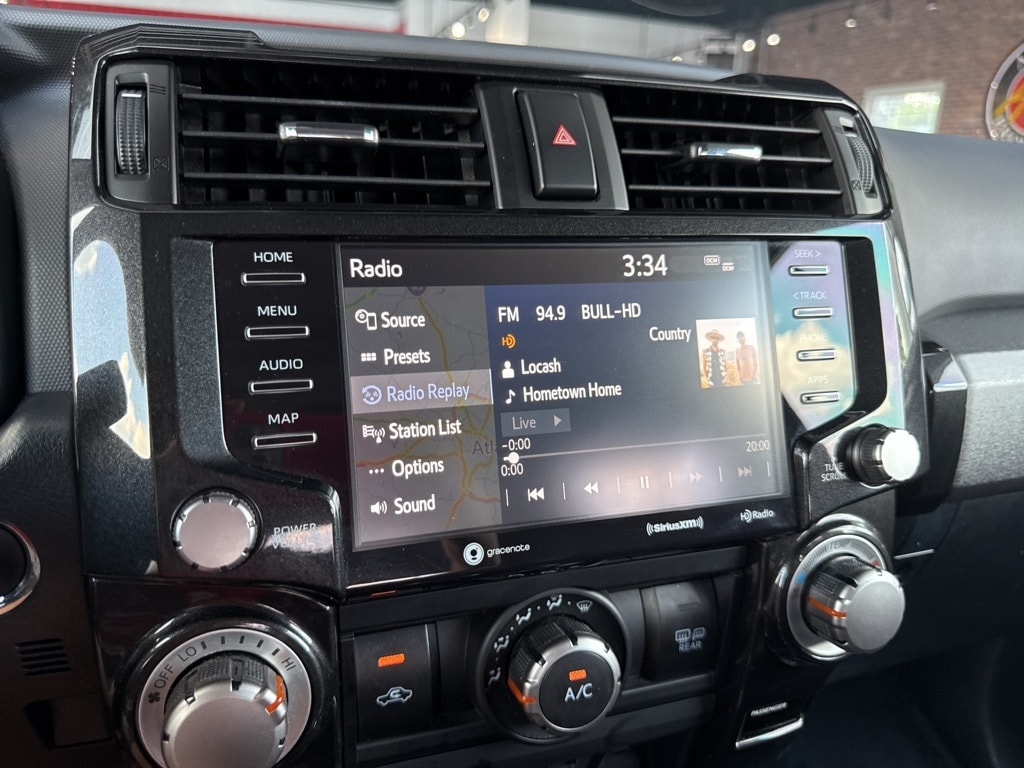Black 2021 Toyota 4Runner TRD Off-Road Premium 4.0L V6 SMPI DOHC 5-Speed Automatic with Overdrive 4D Sport Utility 3.727 Axle Ratio, 4-Wheel Disc Brakes, 8 Speakers, ABS brakes, Air Conditioning, Alloy wheels, AM/FM radio: SiriusXM, Anti-whiplash front head restraints, Apple CarPlay/Android Auto, Auto High-beam Headlights, Auto-dimming Rear-View mirror, Black Roof Rails, Body Color Heated Mirrors, Brake assist, Bumpers: body-color, Compass, Driver door bin, Driver vanity mirror, Dual front impact airbags, Dual front side impact airbags, Electronic Stability Control, Emergency communication system: Safety Connect with 1-year trial, Exterior Parking Camera Rear, Front anti-roll bar, Front Bucket Seats, Front Center Armrest, Front fog lights, Front reading lights, Front wheel independent suspension, Garage Door Opener, Garage door transmitter: HomeLink, Heated door mirrors, Heated Front Bucket Seats, Heated front seats, Illuminated entry, Knee airbag, Leather Shift Knob, Low tire pressure warning, Occupant sensing airbag, Outside temperature display, Overhead airbag, Overhead console, Panic alarm, Passenger door bin, Passenger vanity mirror, Power door mirrors, Power driver seat, Power passenger seat, Power steering, Power windows, Radio: Premium Audio w/Dynamic Navigation, Rear anti-roll bar, Rear seat center armrest, Rear window defroster, Rear window wiper, Remote keyless entry, Roof rack: rails only, Security system, Softex Synthetic Leather Seat Trim, Speed control, Speed-sensing steering, Split folding rear seat, Spoiler, Steering wheel mounted audio controls, Tachometer, Telescoping steering wheel, Tilt steering wheel, Traction control, Trip computer, Turn signal indicator mirrors, Variably intermittent wipers, and Wheels: 17" x 7.5" 7-Spoke Unique Off-Road Alloy.