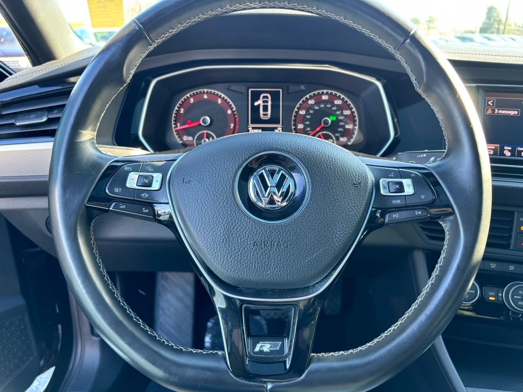 Deep Black Pearl Metallic 2020 Volkswagen Jetta R-Line 1.4L TSI 8-Speed Automatic with Tiptronic 4D Sedan R-Line Cold Weather Package (Front Wiper Heating Area At Bottom Of Windshield, Heated Front Washer Nozzles, Heated R-Line Steering Wheel, Heated Rear Outboard Seating Positions, and Washer Fluid Level Indicator), 8-Speed Automatic with Tiptronic, ABS brakes, Air Conditioning, Alloy wheels, Automatic temperature control, Electronic Stability Control, Front dual zone A/C, Heated door mirrors, Heated Front Comfort Seats, Heated front seats, Illuminated entry, Low tire pressure warning, Power moonroof, Remote keyless entry, Traction control, 17" Twin 5-Spoke Alloy Wheels, 4 Speakers, 4-Wheel Disc Brakes, AM/FM radio, Brake assist, Bumpers: body-color, Delay-off headlights, Driver door bin, Driver vanity mirror, Dual front impact airbags, Dual front side impact airbags, Emergency communication system: VW Car-Net services (capabilities require enrollment or subscription), Exterior Parking Camera Rear, Front anti-roll bar, Front Bucket Seats, Front Center Armrest, Front fog lights, Front reading lights, Front wheel independent suspension, Fully automatic headlights, Leather Shift Knob, Occupant sensing airbag, Outside temperature display, Overhead airbag, Overhead console, Panic alarm, Passenger door bin, Passenger vanity mirror, Perforated V-Tex Leatherette Seat Trim, Power door mirrors, Power steering, Power windows, Radio data system, Radio: Composition Color w/6.5" Touchscreen, Rear anti-roll bar, Rear reading lights, Rear seat center armrest, Rear window defroster, Speed control, Speed-sensing steering, Split folding rear seat, Steering wheel mounted audio controls, Tachometer, Telescoping steering wheel, Tilt steering wheel, Trip computer, Variably intermittent wipers, and VW App-Connect (w/Apple CarPlay, Android Auto & MirrorLink) 8-Speed Automatic with Tiptronic, ABS brakes, Air Conditioning, Alloy wheels, Automatic temperature control, Electronic Stability Control, Front dual zone A/C, Front Wiper Heating Area At Bottom Of Windshield, Heated door mirrors, Heated Front Comfort Seats, Heated front seats, Heated Front Washer Nozzles, Heated R-Line Steering Wheel, Heated Rear Outboard Seating Positions, Illuminated entry, Low tire pressure warning, Power moonroof, R-Line Cold Weather Package, Remote keyless entry, Traction control, Washer Fluid Level Indicator.